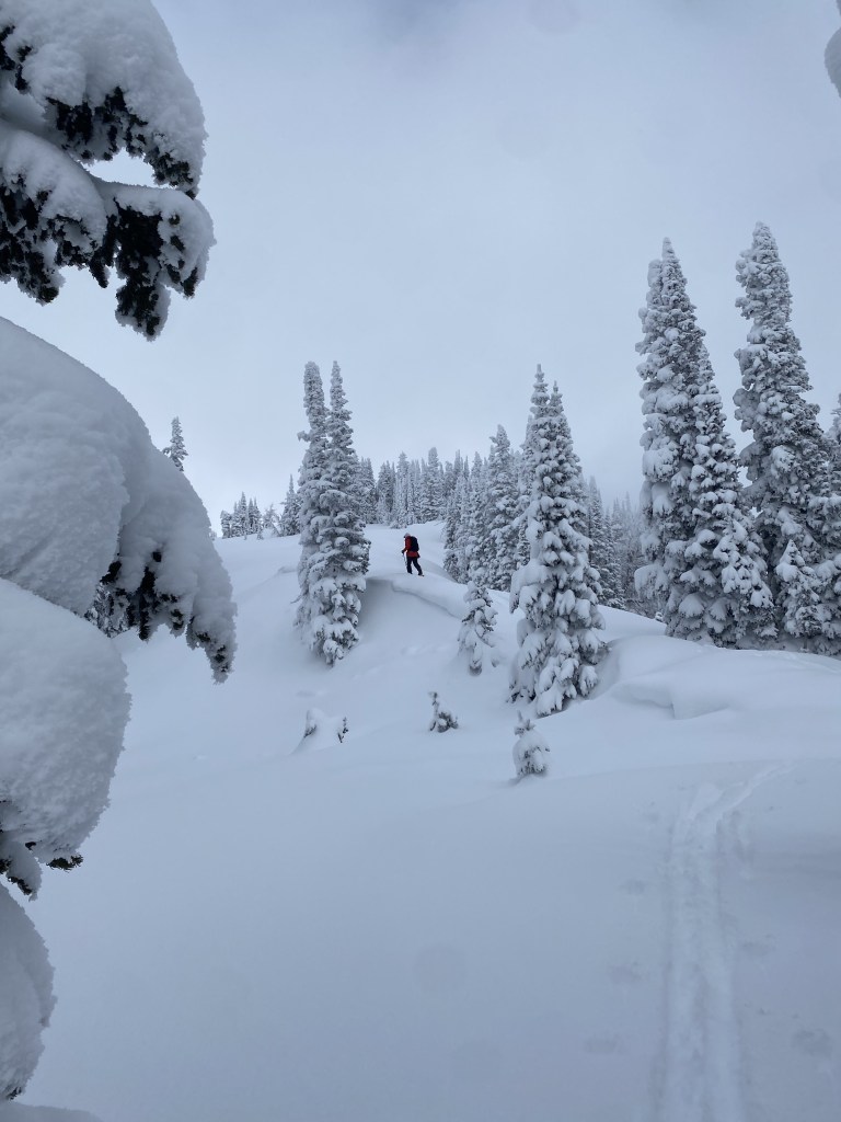 While the skin track up the canyon makes a couple jack-knife turns near the top, we decided to dip off into the woods in search of a shorter way. I wouldn’t recommend this as the trees were tight with a lot of dead fall; making the navigating difficult and steep at times. Ben and I are often sucked into a good bushwhack to our own chagrin. The wiser and faster route is to enter and egress using the Plummer canyon skin track.