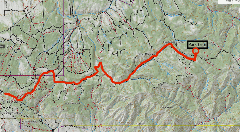 The goal kind of just rolled in my head from time to time for a few months until a dry, sunny, and slightly smoky Saturday in July, I had some plans fall through, and late in the day I was just mulling around the house feeling a little stir crazy and sorry for myself, and I thought, “why not start today?” So on a whim, that’s how I officially started the County Highpoint list and ended up on Red Butte. I looked at the map, slapped my trail running vest together and set off for the highest point in Madison County, ID. Why not start the list in the county that I, my father, and my grandfather were all born in.