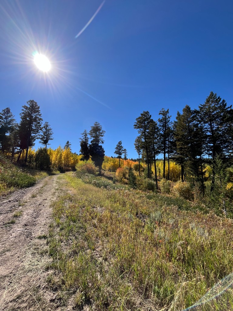 As I climbed up the easily runnable dirt access road the leaves just got better and better. I don’t usually track the fall leaves very well and often miss them, but I hit these aspens just right. The temperature was also really nice. After making sure to stop and take a few pictures along the way I arrived at the top of the Gunpowder ski lift. From here, the trail drops a couple hundred feet into a gully before making a sharp left turn onto a barely noticeable single track leading you into a dense section of woods.