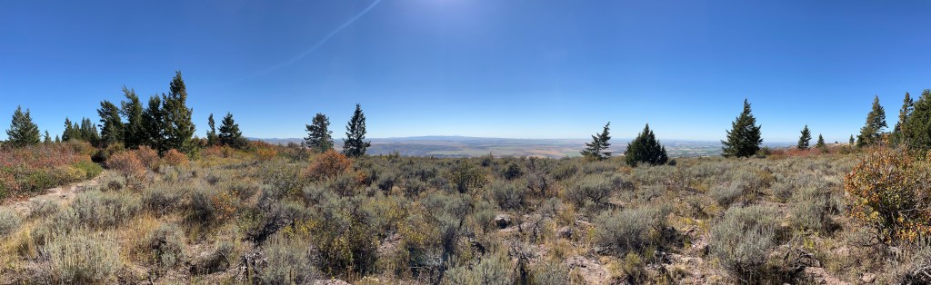 After a very short while the trail cuts right onto another motorized access trail and the woods open up onto a sagebrush covered hill. From here it was only a few minutes in the sun and a very easy slope to the summit. There is no marker on this county high point as far as I could tell, just some rocks off the path that were higher than anything around them and good views. The weather was perfect and the visibility was good. I could see out into the Snake River Plain and was able to pick out Bear Den Butte off in the distance.