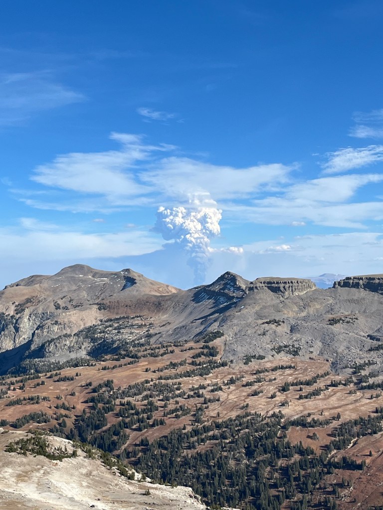 Although the mountains are always gorgeous, the most prominent and noticeable detail of our summit was the Park Trail Fire to the east, sending an ashen, grey plume thousands of feet into the air. The day of our hike it was reported to have burned over 72,000 acres. While I know wildfire saddens many, there was something I found eerily still about the inverted cloud hanging over Mount Hunt. I had a hard time looking away; transfixed upon how something could be chaotic, but from a distance show peace. (There’s probably a good metaphor about stepping back from our chaotic lives in there somewhere.)