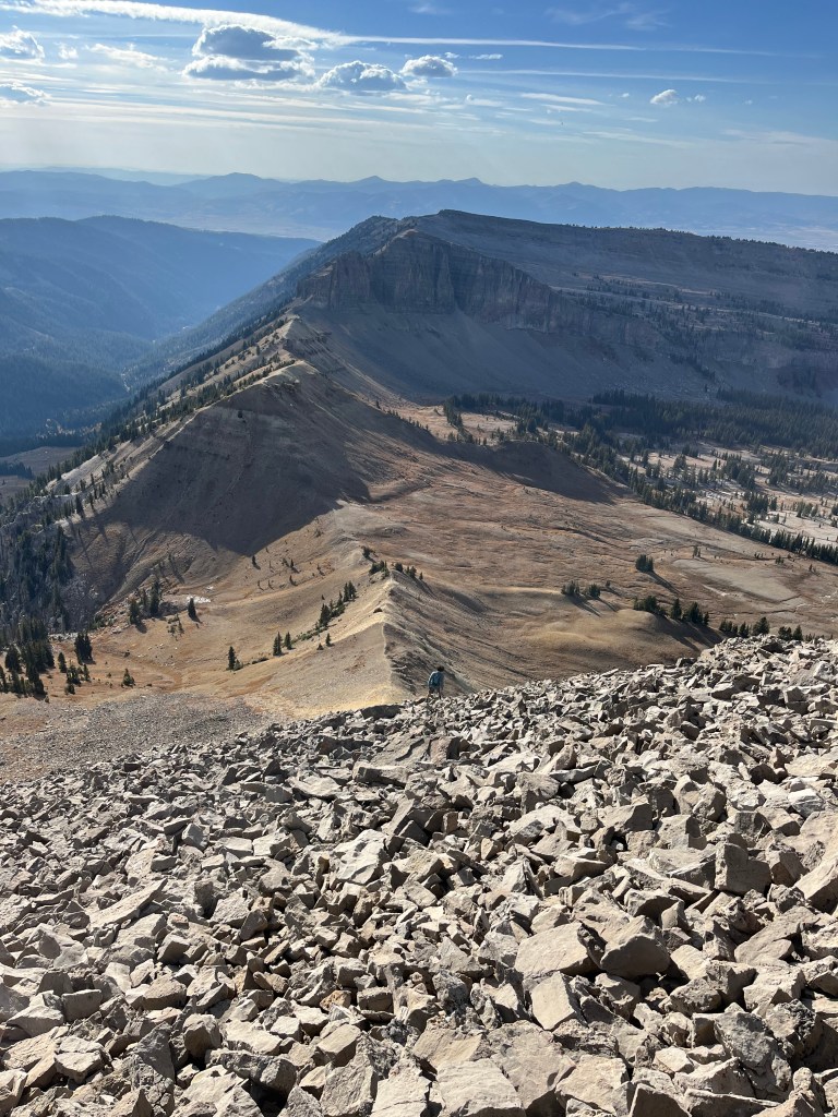 At this point, it was all over but the crying. And much crying was to be had as we climbed the 1,000 feet of talus slope heading toward the summit. The ridge to the top is not exposed and is much less scary than it looks from other angles, but it is steep and the rock is loose. I had not ventured much into the Tetons this summer because of triathlon training, and I was definitely feeling the altitude and burning quads as we passed 10k feet. After a longer than hoped for rock slipping crawl we made out way onto the flat, wide summit of Fossil Mountain.