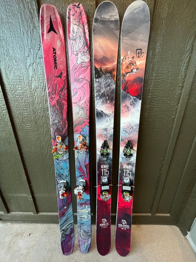 If the snow is coming down heavy then I opt for my powder setup. The wide shovels and tails on my 2018 Icelantic Nomad 115’s (right) are great. They are a little too heavy for long days and their width is hard on the hips in the skin track on longer trips, so they don’t get skied as much as they once did but I still love them. They take chop and crud like a champ and they surf pow like it’s going out of style. They are mounted with Dynafit Radical TLT 2.0 bindings, on of the best bindings Dynafit ever made, in my opinion.